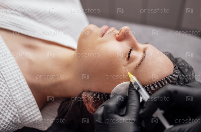 Женщина-косметолог в прозрачных перчатках делает укол в нижнюю челюсть своей клиентки