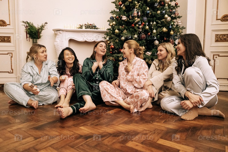 Молодые женщины в пижамах смеются и сидят под украшенной рождественской елкой в гостиной
