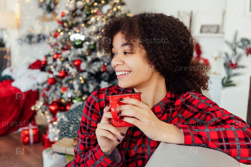 Симпатичная африканская женщина в пижаме сидит на диване и держит кружку в спальне