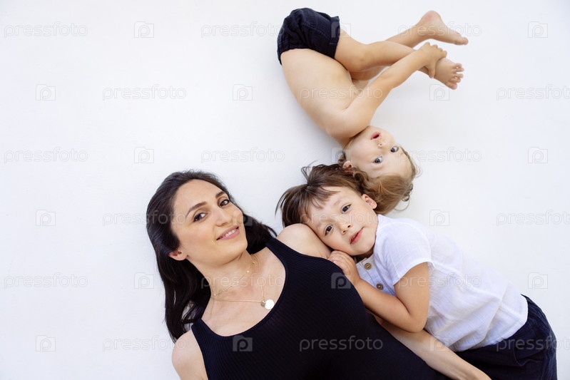 Молодая беременная женщина с ее милыми сыновьями в повседневной одежде лежат на белом полу. Привлекательная мама развлекается со своими мальчиками дома
