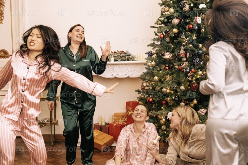 Новогодняя пижамная домашняя вечеринка. Молодые женщины в пижамах танцуют возле елки в гостиной. Привлекательные девушки разных рас весело проводят время вместе