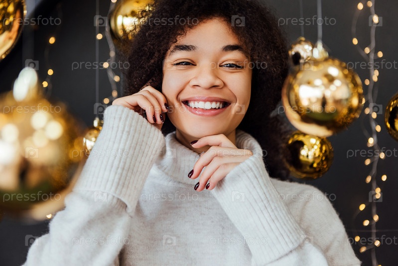 Молодая африканская женщина с вьющимися волосами улыбается и стоит среди золотых рождественских украшений. Смеющаяся черная девочка в уютном белом свитере. Блестящие шары и гирлянды