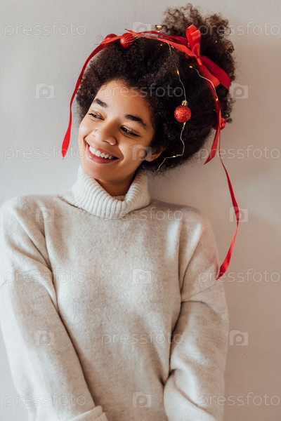 Крупный план молодой афроамериканки с вьющейся прической, украшенной красной лентой, гирляндой и рождественскими шарами. Милая черная девочка в теплом свитере готовится к новогодней вечеринке