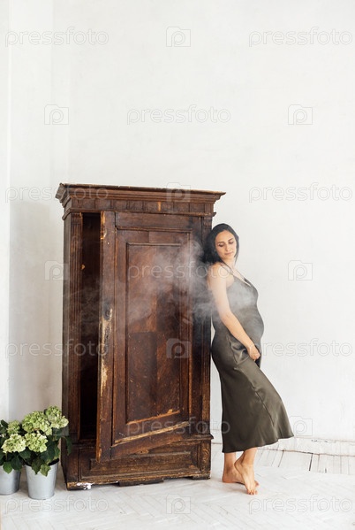 Молодая беременная женщина в атласном платье улыбается и стоит у старинного деревянного шкафа. Спокойная безмятежная брюнетка нежно держит свой живот в деревенском ретро-интерьере