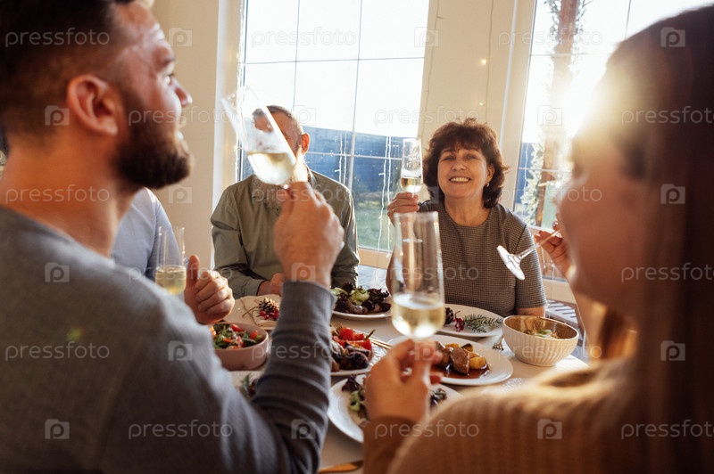 Счастливая большая семья за обеденным столом в столовой дома