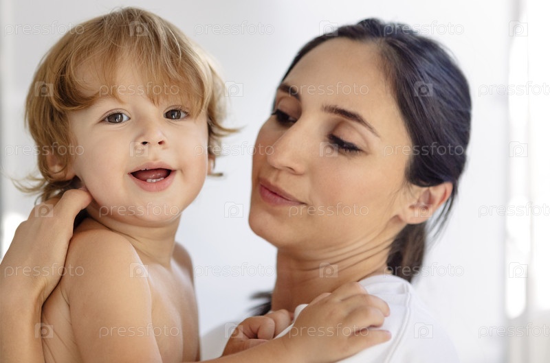Портрет крупным планом милого малыша с очаровательной мамой в белой повседневной одежде. Молодая привлекательная женщина улыбается и обнимает своего маленького сына. Дама держит смеющегося милого ребенка