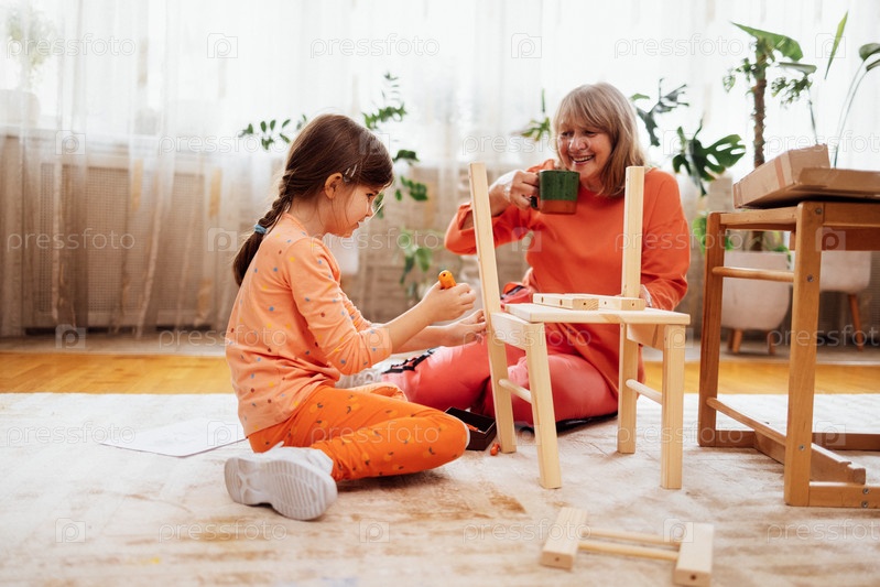 Пожилая женщина в повседневной одежде и ее маленькая внучка собирают новый деревянный стул