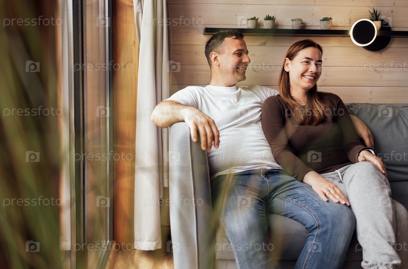 Молодая супружеская пара сидит на диване в гостиной. Привлекательные мужчина и женщина обнимаются и смеются дома. Счастливые муж и жена проводят время вместе