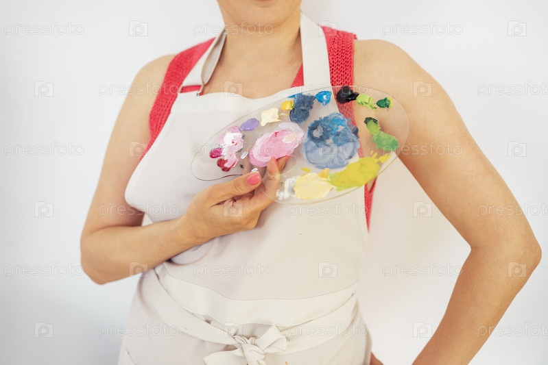 Крупный план ухоженных женских рук, держащих пластиковую палитру со смешанными цветами