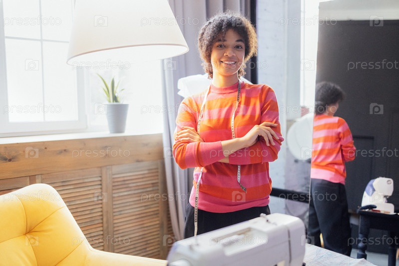 Молодая смеющаяся африканская женщина стоит рядом с манекеном портнихи