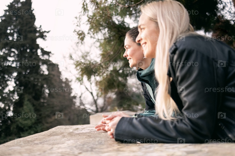 Две молодые девушки опираются на старые каменные перила и наслаждаются видом