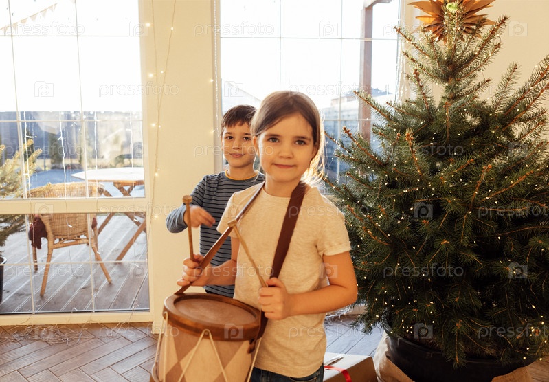 Милые дети играют в гостиной возле украшенной рождественской елки дома. Маленькая девочка и ее брат бьют по старинному барабану в гостиной