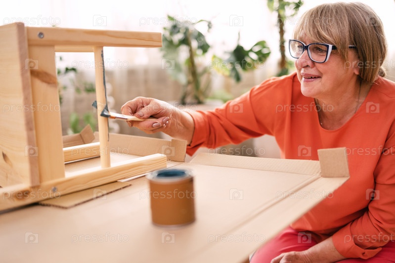 Пожилая женщина в оранжевой повседневной одежде красит деревянный стул в гостиной