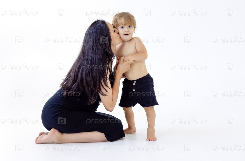 Молодая беременная женщина в белом платье смеется и целует своего малыша