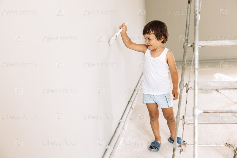 Крупный план маленького мальчика, который красит стену. Милый малыш рисует на стене