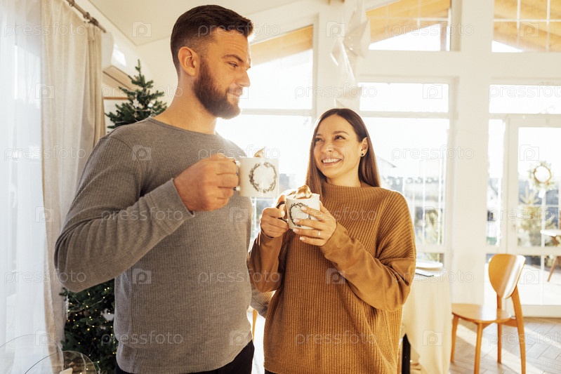 Молодая супружеская пара пьет кофе дома. Красивый мужчина с бородой и его милая жена смеются и наслаждаются капучино в гостиной