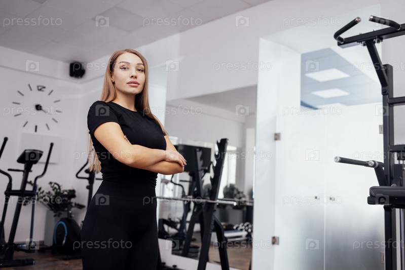 Портрет красивой здоровой женщины-тренера в черной спортивной одежде со скрещенными руками, позирующей на фоне современного тренажерного зала