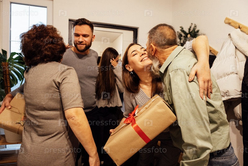 Пожилая пара встречает своих улыбающихся гостей дома