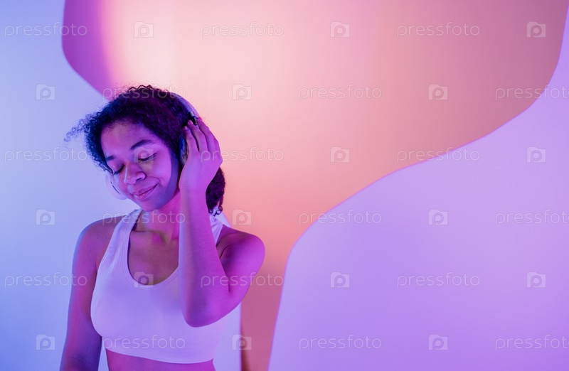 Портрет крупным планом молодой африканки в наушниках. Улыбающаяся черная девушка в белом топе закрыла глаза и наслаждается музыкой. Кудрявая счастливая женщина расслабляется