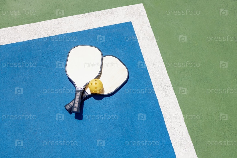 На сине-зеленой открытой площадке лежат две ракетки для пиклбола и желтый мяч