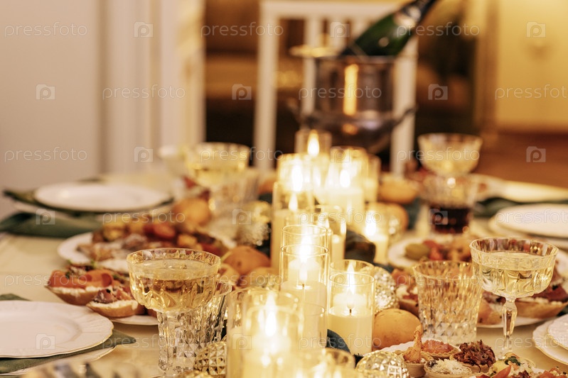 Уютная стильная гостиная с накрытым столом и украшенной новогодней елкой с гирляндой