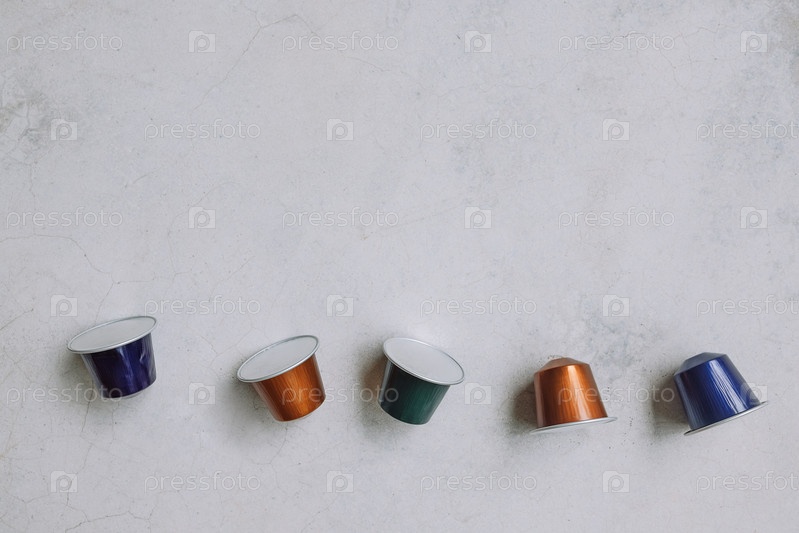 Разноцветные кофейные капсулы разбросаны по светлой мраморной поверхности. Яркие металлические оттенки. Современная и минималистичная эстетика