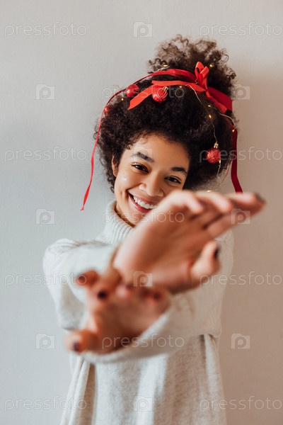 Крупный план молодой африканки с кудрявой прической, украшенной красной лентой, гирляндой и рождественскими шарами