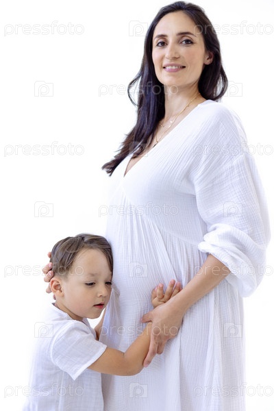 Молодая беременная женщина в белом платье с милым сыном. Маленький мальчик нежно обнимает живот своей очаровательной улыбающейся матери. Белый изолированный фон. Счастливая семья