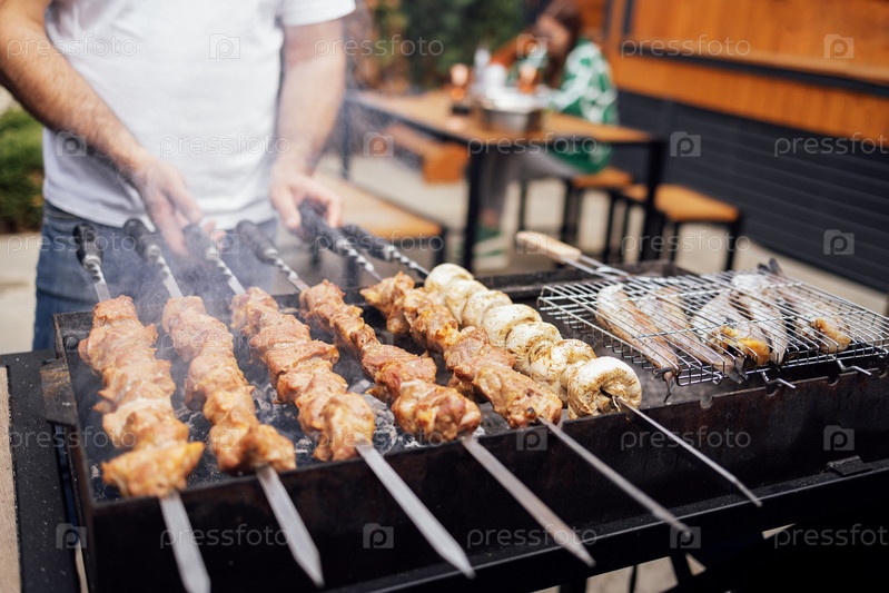 Крупный план мужских рук, держащих шампуры с мясом, грибами и жареной рыбой. Мужчина готовит вкусные куски мяса, запеченные на углях. Свежий шашлык на открытом костре