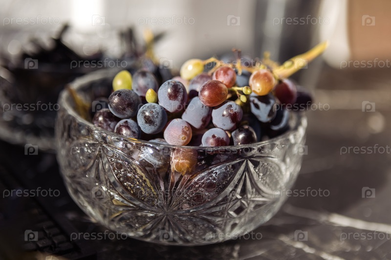 Крупный план синего свежего сочного винограда в хрустальной вазе. Ароматные ягоды в стеклянной тарелке на мраморном черном столе