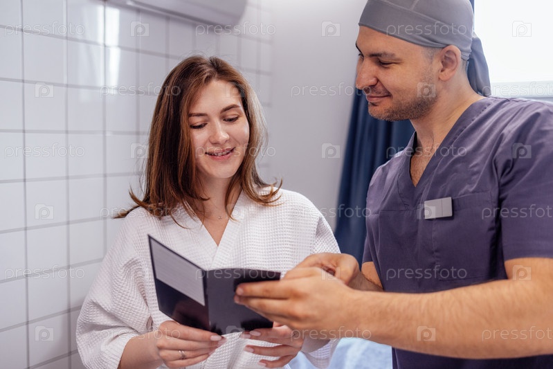 Молодая улыбающаяся женщина в белом халате просматривает каталог процедур и получает консультацию массажиста в салоне красоты или клинике