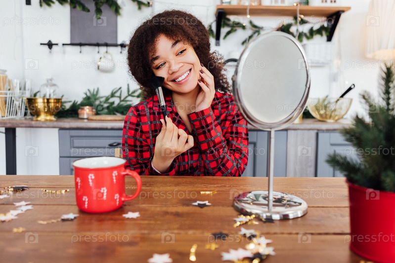 Милая африканка в красной клетчатой пижаме сидит за столом и наносит макияж кисточкой. Черная девочка в уютной кухне с рождественскими украшениями и кружкой