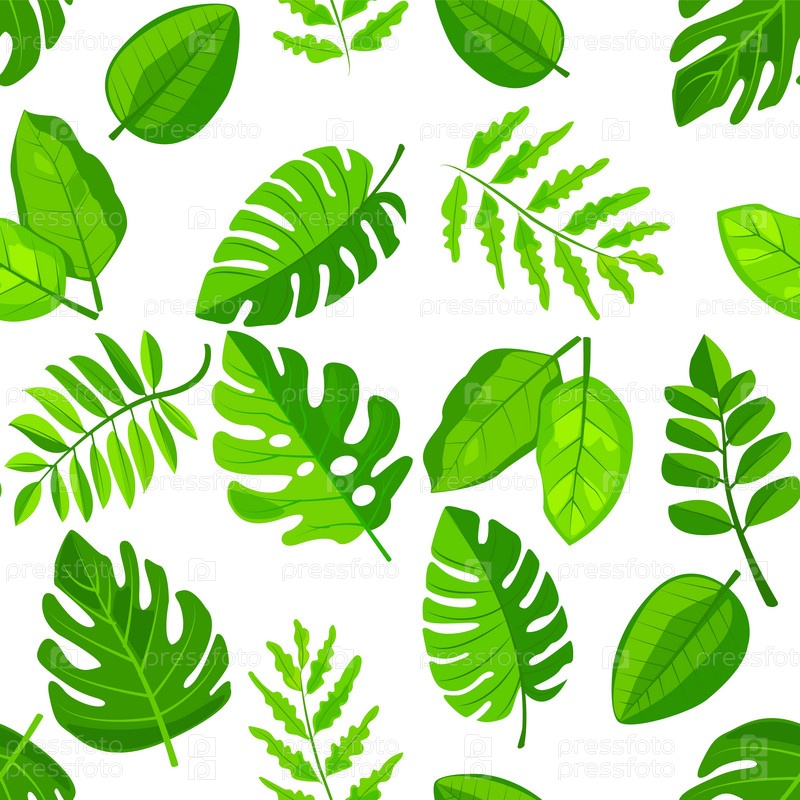 Бесшовный узор из ярких зеленых листьев на белом фоне. Различные формы и размеры листьев создают свежий, естественный и тропический вид, идеально подходящий для экологически чистых или ботанических проектов