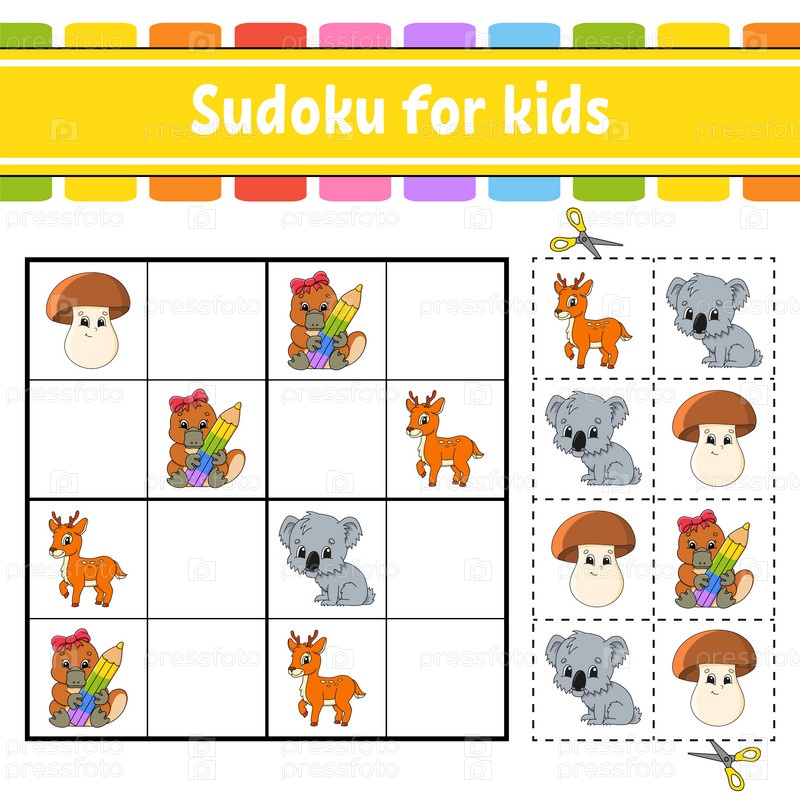 Судоку для детей. Образовательный развивающий рабочий лист. Страница с заданиями с картинками. Игра-головоломка для детей. Тренировка логического мышления. Изолированная векторная иллюстрация. Забавный персонаж. Мультяшный стиль
