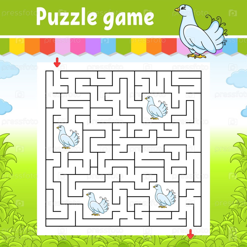 Квадратный лабиринт. Игра для детей. Головоломка для детей. Загадка лабиринта. Цветная векторная иллюстрация. Найдите правильный путь. Изолированная векторная иллюстрация. персонаж мультфильма