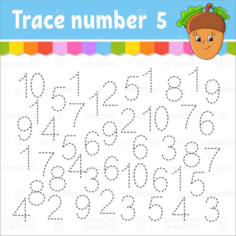 Номер трассировки. Практика письма. Изучение цифр для детей. Развивающий рабочий лист для обучения. Страница с заданиями. Векторная иллюстрация
