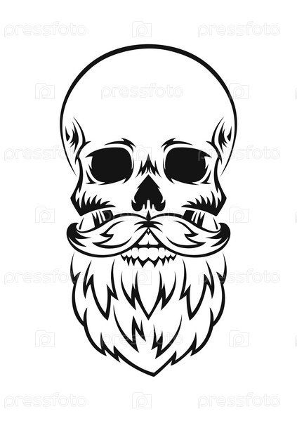 Человеческий череп с бородой и усами. Черный силуэт. Элемент дизайна. Нарисованный от руки эскиз. Винтажный стиль. Векторная иллюстрация