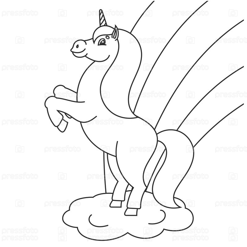 Раскраска для детей. Волшебный единорог встал на дыбы. Животное-лошадь стоит на задних ногах. Мультяшный стиль. Простая плоская векторная иллюстрация