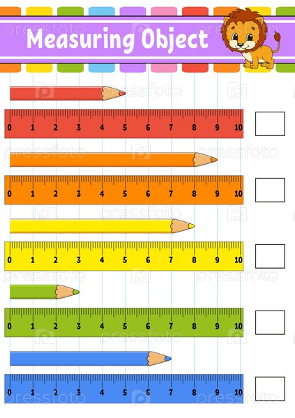 Измерение объекта линейкой. Образовательный развивающий рабочий лист. Игра для детей. Цветная страница с заданиями. Головоломка для детей. Милый персонаж. Векторная иллюстрация. Мультяшный стиль