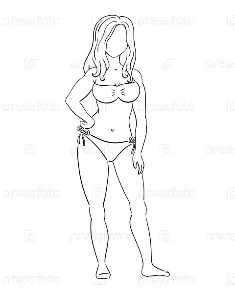 Красивая девушка в купальнике. Контур контура. Элемент дизайна. Векторная иллюстрация изолирована на белом фоне. Шаблон для книг, наклеек, плакатов, открыток, одежды