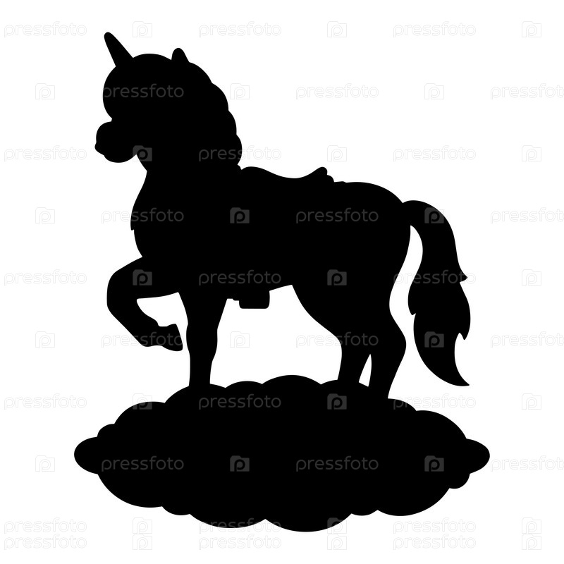Черный силуэт. Волшебный единорог. Сказочная лошадь. Элемент дизайна. Векторная иллюстрация, изолированная на белом фоне. Шаблон для книг, наклеек, плакатов, открыток, одежды