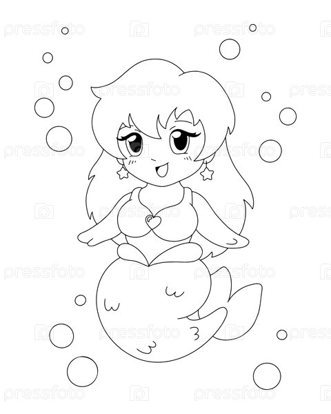 Раскраска для детей. Красивая пухлая русалочка. Персонаж в мультяшном стиле. Векторная иллюстрация на белом фоне