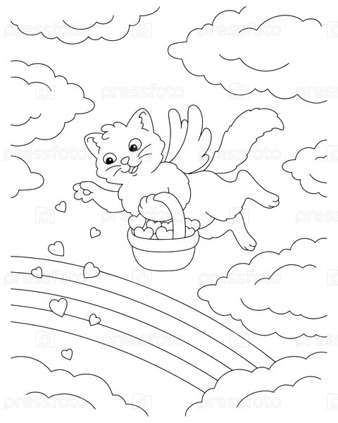 Кот разбрасывает сердца из корзины. Раскраска для детей. День святого Валентина. Персонаж в мультяшном стиле. Векторная иллюстрация на белом фоне