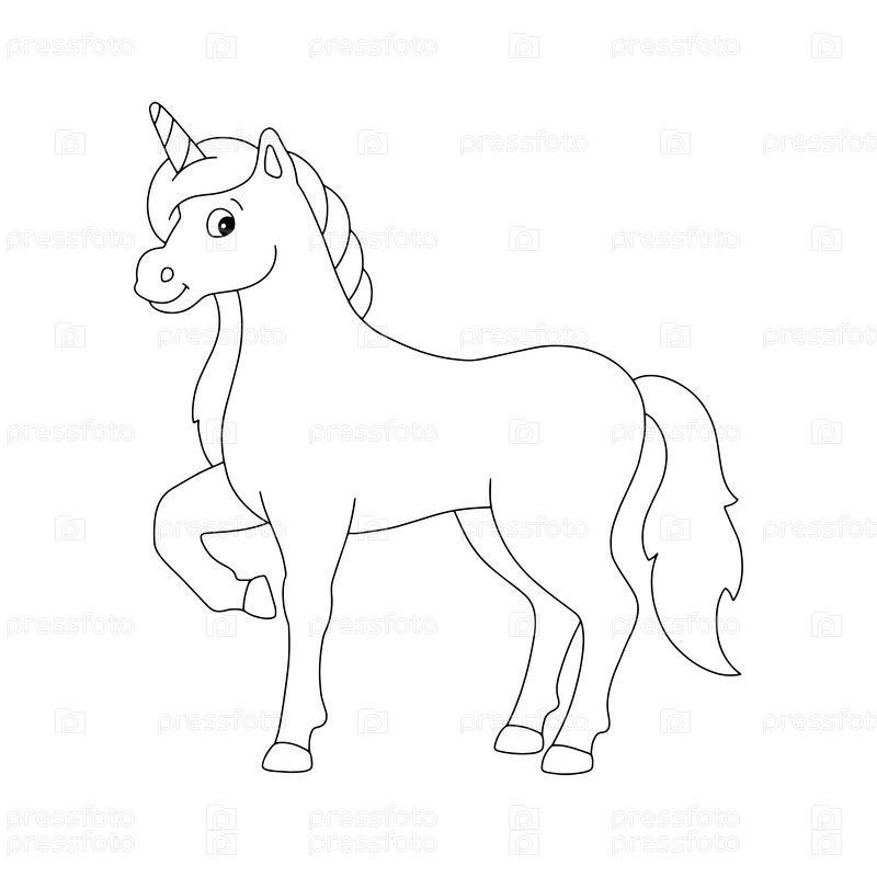Волшебный единорог. Сказочная лошадь. Раскраска для детей. Цифровая марка. Персонаж в мультяшном стиле. Векторная иллюстрация на белом фоне