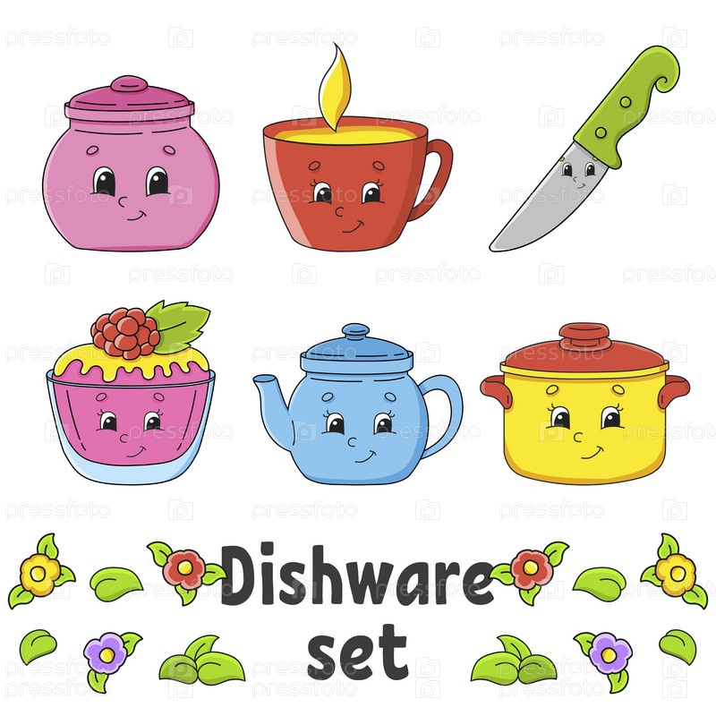 Набор наклеек с милыми персонажами мультфильмов. Нарисовано от руки. Красочная упаковка. Векторная иллюстрация. Тема посуды. Коллекция нашивок для детей. Для ежедневника, органайзера, дневника