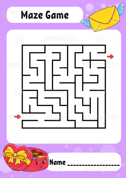 Квадратный лабиринт. Игра для детей. Забавный лабиринт. Образовательный развивающий рабочий лист. Страница с заданиями. Головоломка для детей. День святого Валентина. Загадка для дошкольников. Логическая головоломка. Цветная векторная иллюстрация