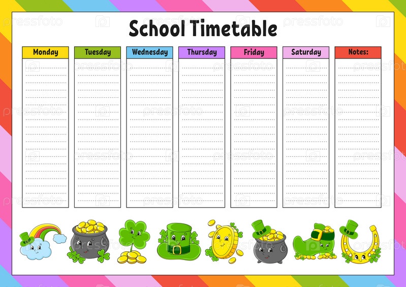 Расписание школы. Расписание для школьников. Пустой шаблон. Еженедельный планировщик с заметками. персонаж мультфильма. Векторная иллюстрация