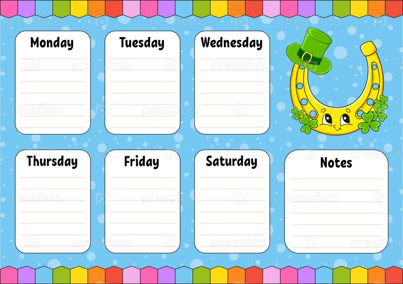 Расписание школы. Расписание для школьников. Пустой шаблон. Еженедельный планировщик с заметками. персонаж мультфильма. Векторная иллюстрация