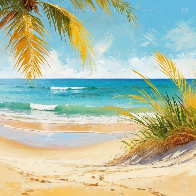 Спокойная пляжная сцена с мягкими волнами, песчаным берегом и пальмами, отбрасывающими тени. Яркие цвета и мягкие мазки создают умиротворяющую атмосферу. Сгенерированный ИИ. Путешествия на солнечном пляже