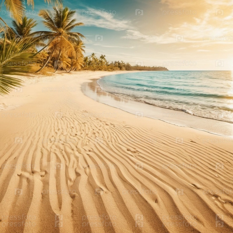 Спокойная пляжная сцена с мягкими волнами, песчаным берегом и пальмами, отбрасывающими тени. Яркие цвета и мягкие мазки создают умиротворяющую атмосферу. Сгенерированный ИИ. Путешествия на солнечном пляже